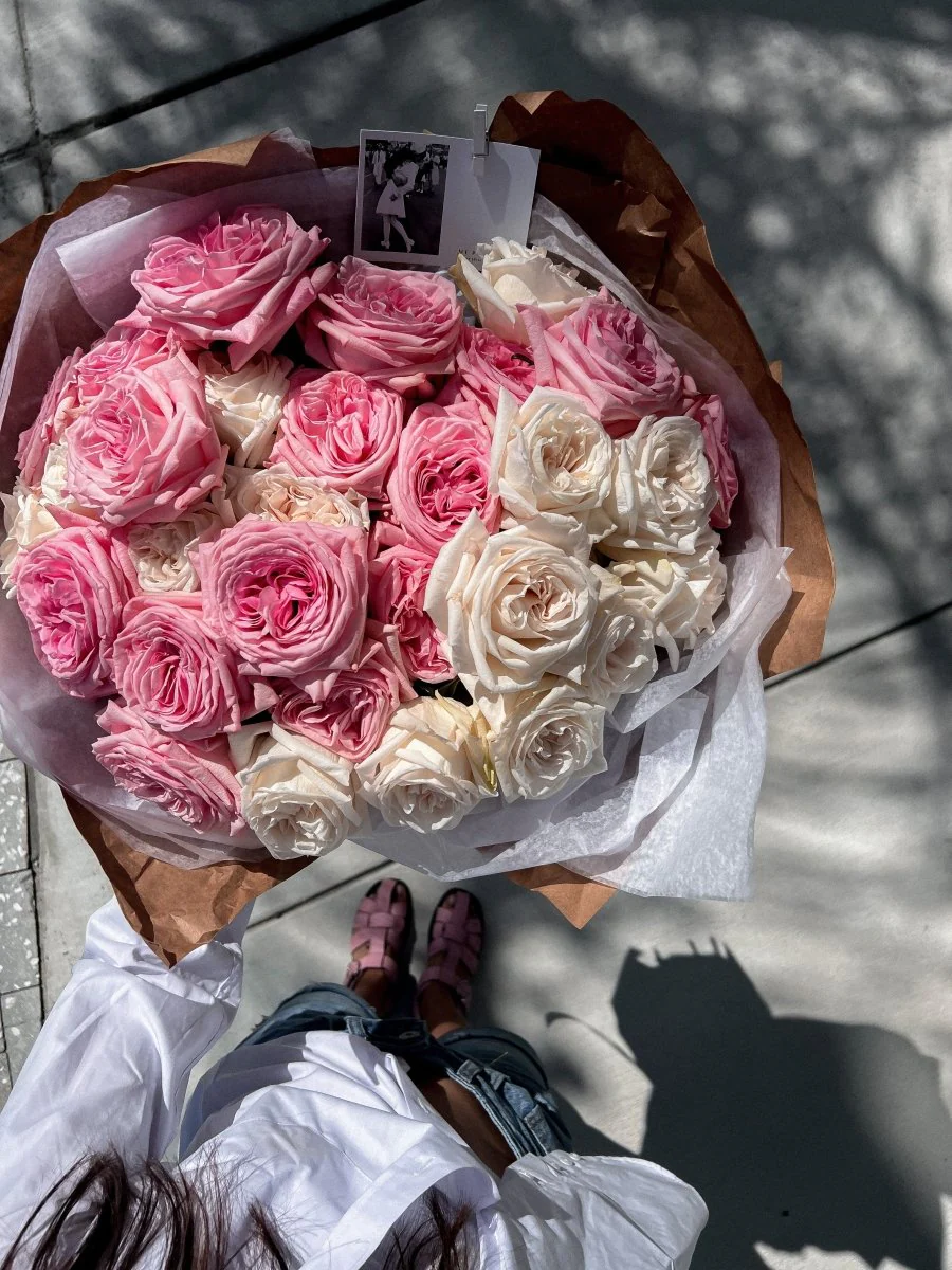 Duo bouquet of pink and white O’Hara garden roses is the best decision to please your loved ones.